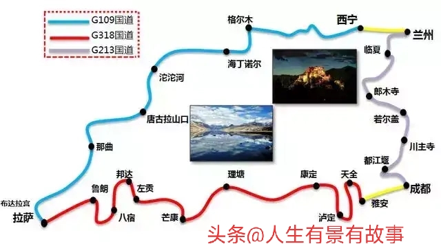 从四川成都出发,一路提升着自己的海拔,经雅安向西翻越二郎山,沿途越过大渡河、雅砻江、金沙江、澜沧江、怒江上游,经雅江、理塘、巴塘过竹巴笼金沙江大桥入藏,再经芒康、左贡、邦达、八宿、然乌、波密、林芝、墨竹工卡、达孜抵拉萨。